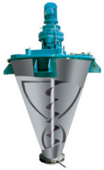產(chǎn)品概述:由擺線針輪減速機連接中心螺桿及外層螺帶以相同轉(zhuǎn)速轉(zhuǎn)動。工作時,中心螺桿將混合物料由底部提升到頂部,同時線速度較大的外部螺帶將物料由下而上沿錐形筒壁盤提升,二種運動在離心力作用下又將物料沿切線方向拋向空間,物料產(chǎn)生強烈的對流剪切、擴散,從而達到快速混合的目的。(螺桿也可做成反向螺桿)。