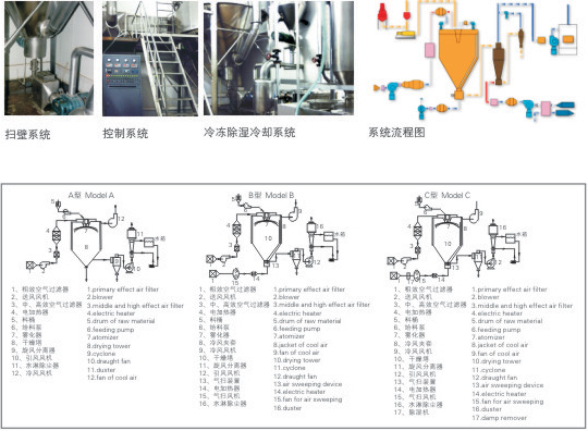 該機采用全封閉形式,所有部件均采用不銹鋼制造,配有三級凈化裝置,過濾后的空氣達十萬級要求 。簡體與頂部裝有冷壁裝置,使壁溫<80℃,物料在壁上停留也不焦化變質(zhì)現(xiàn)象,大大增加了收粉率(達95%以上),而且不會產(chǎn)生混藥現(xiàn)象和粘壁現(xiàn)象。